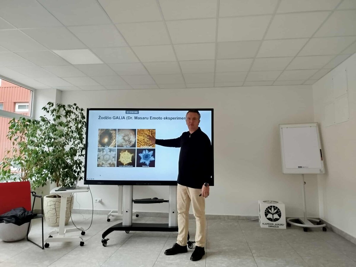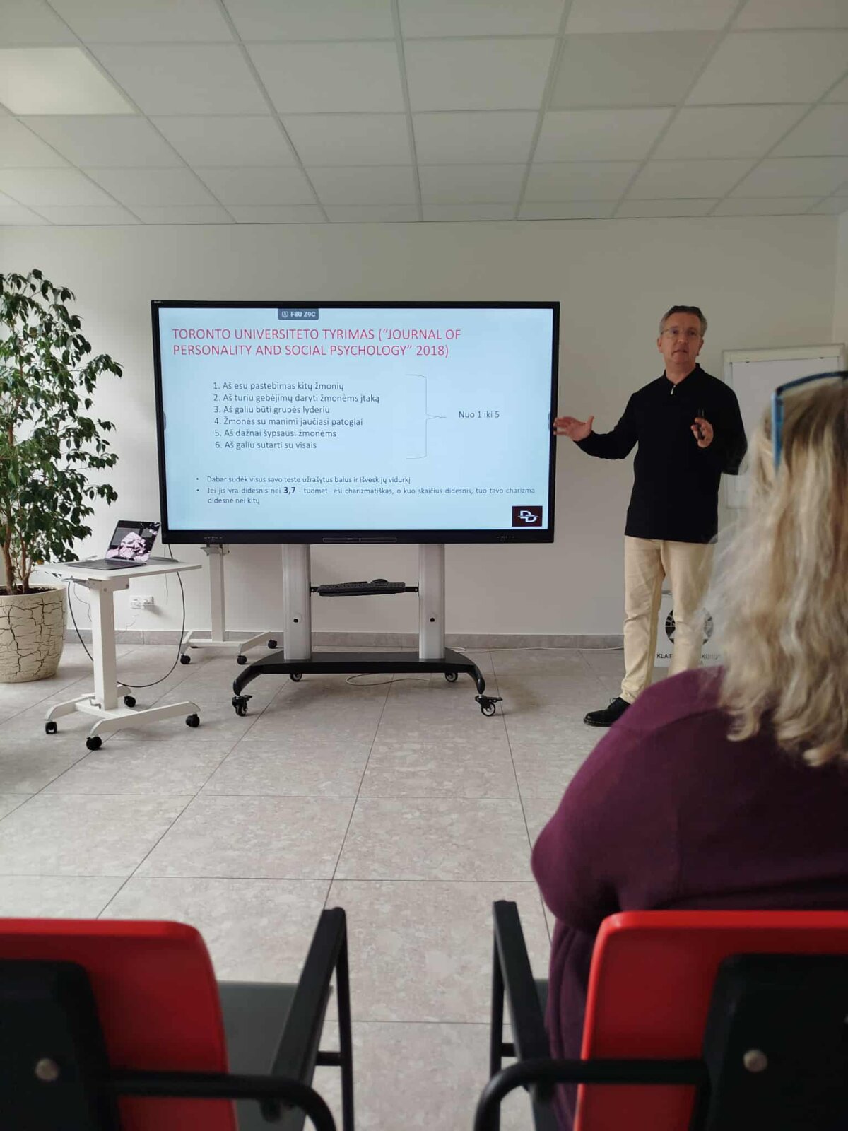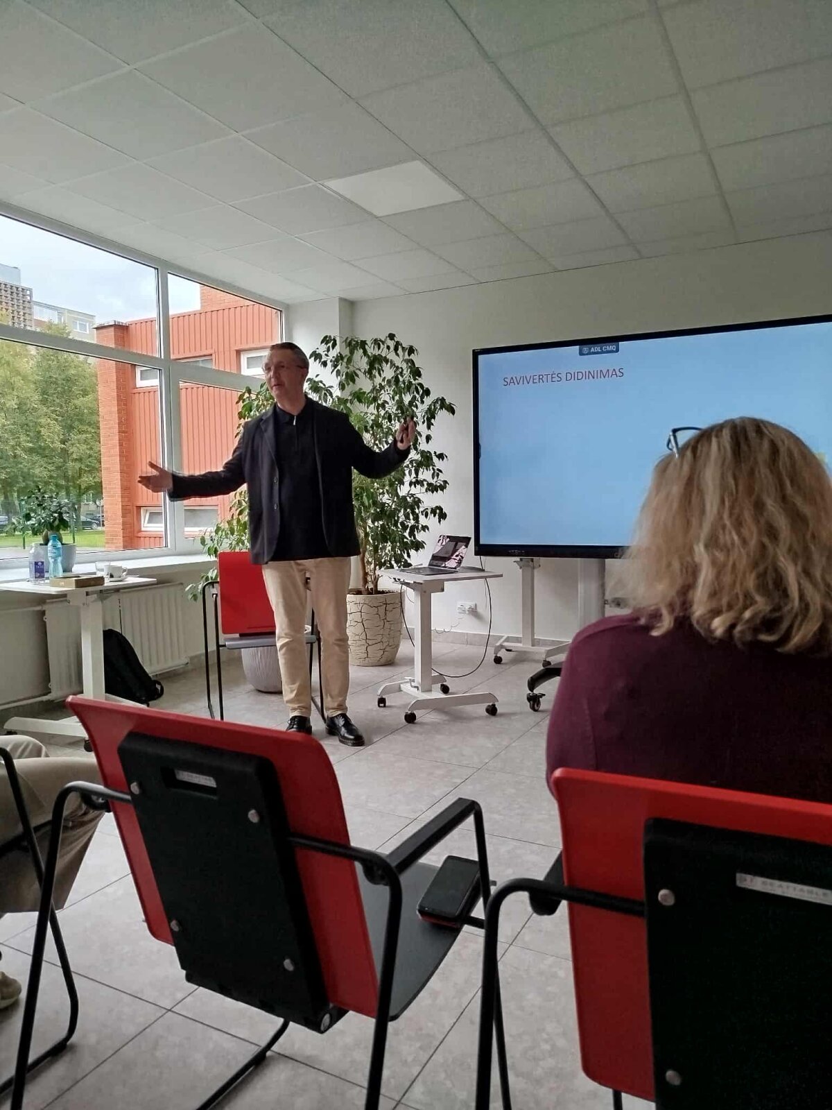 Šiandien mokytojai turėjo unikalią galimybę - lektoriaus Donaldo Duškino padedami galėjo pastiprinti komunikacijos kompetenciją. Donaldas Duškinas – retorikos mokytojas, įkūręs „Retorikos akademiją“, keletos knygų apie retorikos meną autorius. Taip pat dirba koučingo specialistu, yra vaikščiojimo žarijomis, stiklais instruktorius bei dramos teatro režisierius.