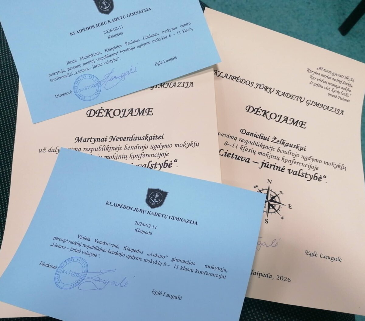 Šiandien 25JUL1 gr. mokinė Martyna Neverdauskaitė ir 25JUL1(modulis) "Aukuro" gimnazijos mokinys Danielius Želkauskas skaitė pranešimą respublikinėje bendrojo ugdymo mokyklų konferencijoje "Lietuva - jūrinė valstybė" Klaipėdos jūrų kadetų gimnazijoje. Pranešimo tema - "Jūrų uosto logistika per mokinių patirtinius užsiėmimus". Sveikiname pranešėjus laimėjus specialiąją Klaipėdos universiteto nominaciją šaunuoliai!