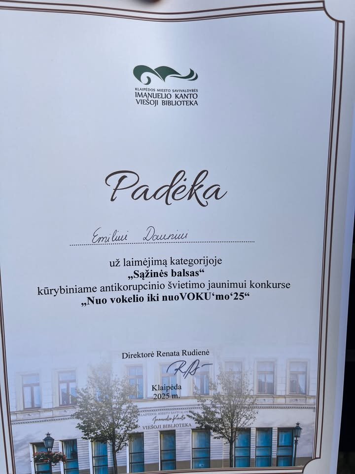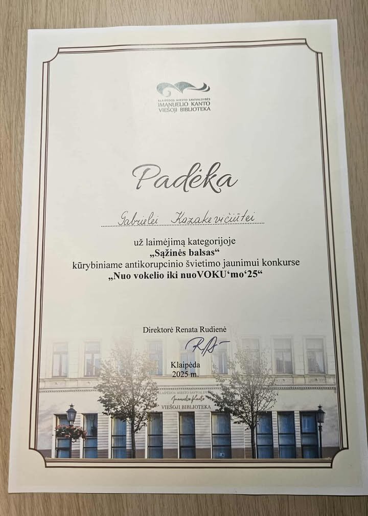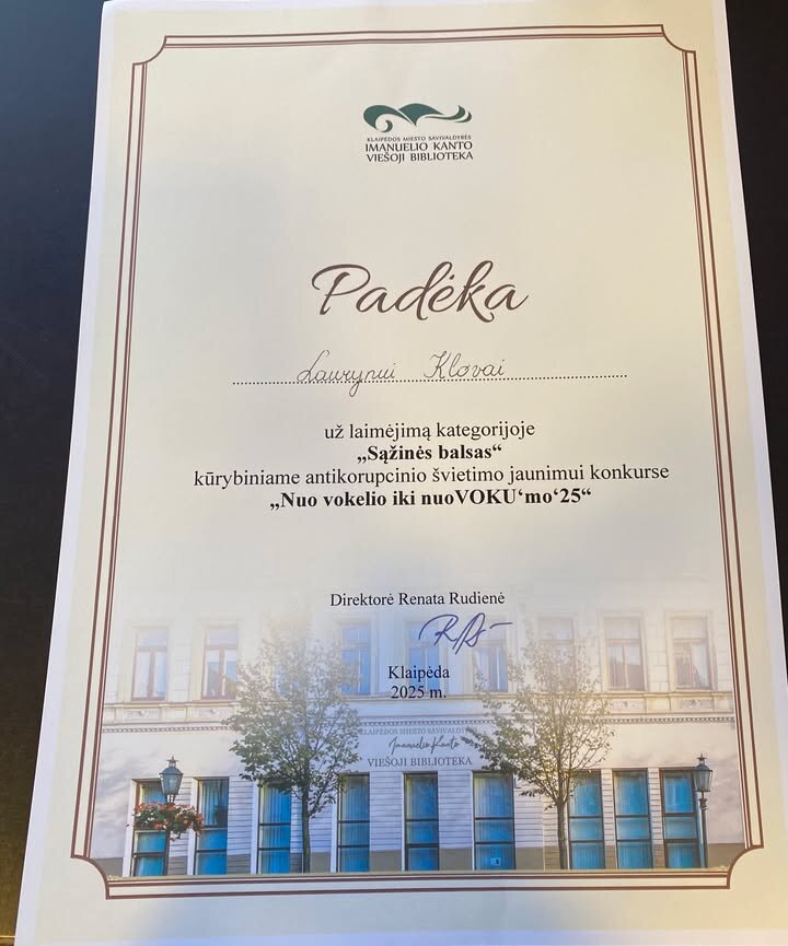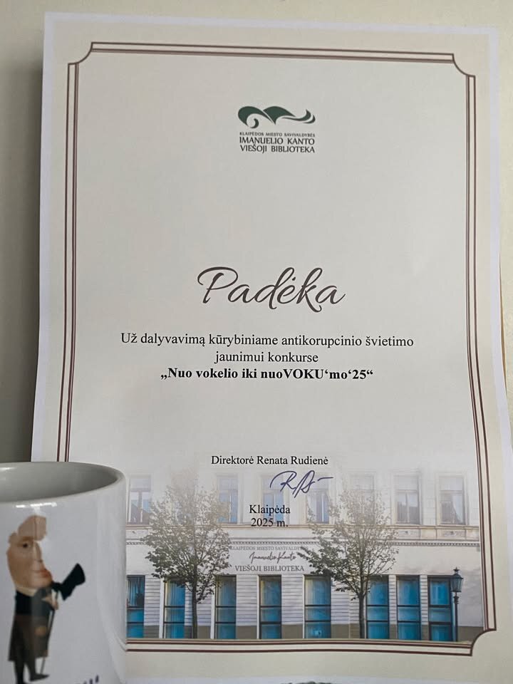 Gruodžio 9 d. Klaipėdos miesto savivaldybės Imanuelio Kanto viešosios bibliotekos Jaunimo bibliotekoje įvyko kūrybinio antikorupcinio švietimo konkurso jaunimui „Nuo vokelio iki nuoVOKU‘mo‘25“ apdovanojimų renginys, skirtas paminėti Tarptautinę antikorupcijos dieną.