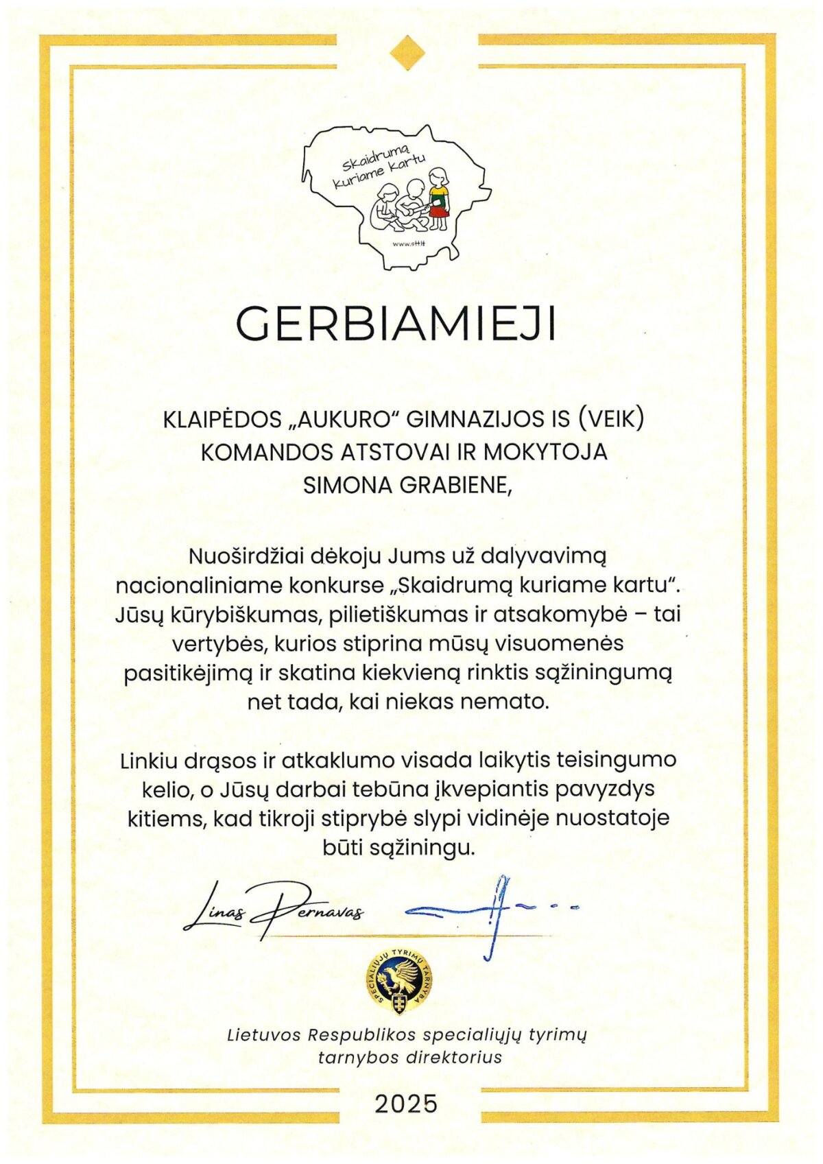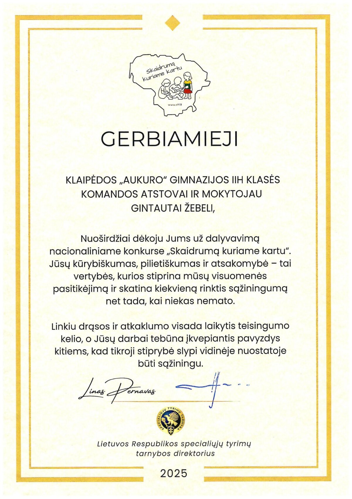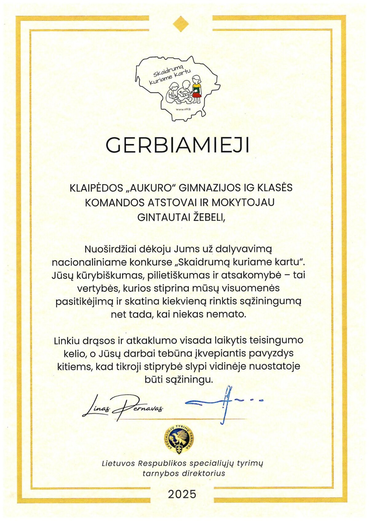 Konkursas „Skaidrumą kuriame kartu'25“ vyko 2025 m. spalio 8 d. – lapkričio 12 d., jame dalyvauti buvo kviečiami 8–12 klasių mokiniai. „Aukuro" gimnazijai atstovavo I S(veik), I G ir II H klasių komandos (ruošė mokytojai S. Grabienė ir G. Žebelis). Organizatoriai – Lietuvos Respublikos specialiųjų tyrimų tarnyba (STT) ir partneriai.