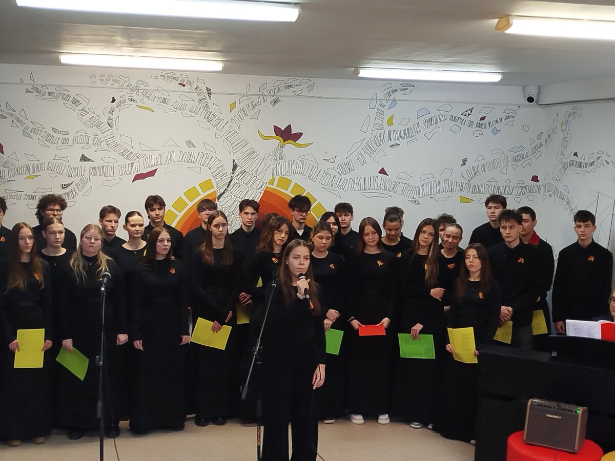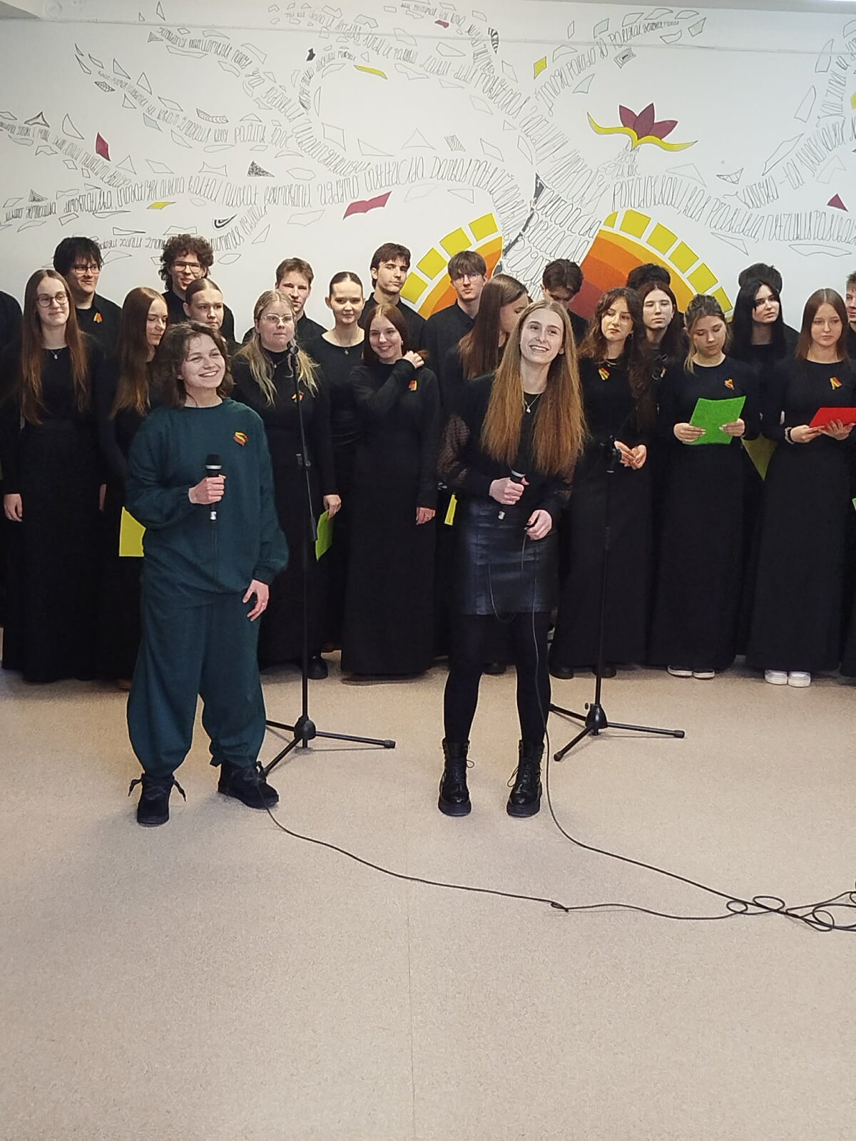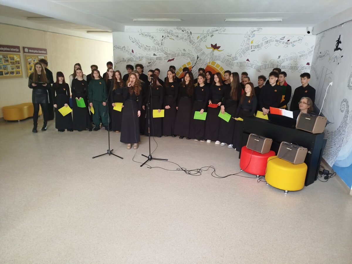 Visą savaitę gimnazistai dalyvavo įvairiose veiklose: istorijos olimpiadoje „Vytauto Didžiojo asmenybė Lietuvos istorijoje", nacionaliniame konkurse „Lietuvos istorijos žinovas 2026, netradicinėje istorijos pamokoje „Vardan tos...", rinko informaciją ir kūrė stendus. Šiandien iIgosios pertraukos metu visi susibūrėme į koncertą „Į Lietuvą. Gyvenimui...", skirtą Lietuvos valstybės atkūrimo dienai paminėti.