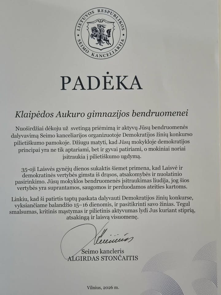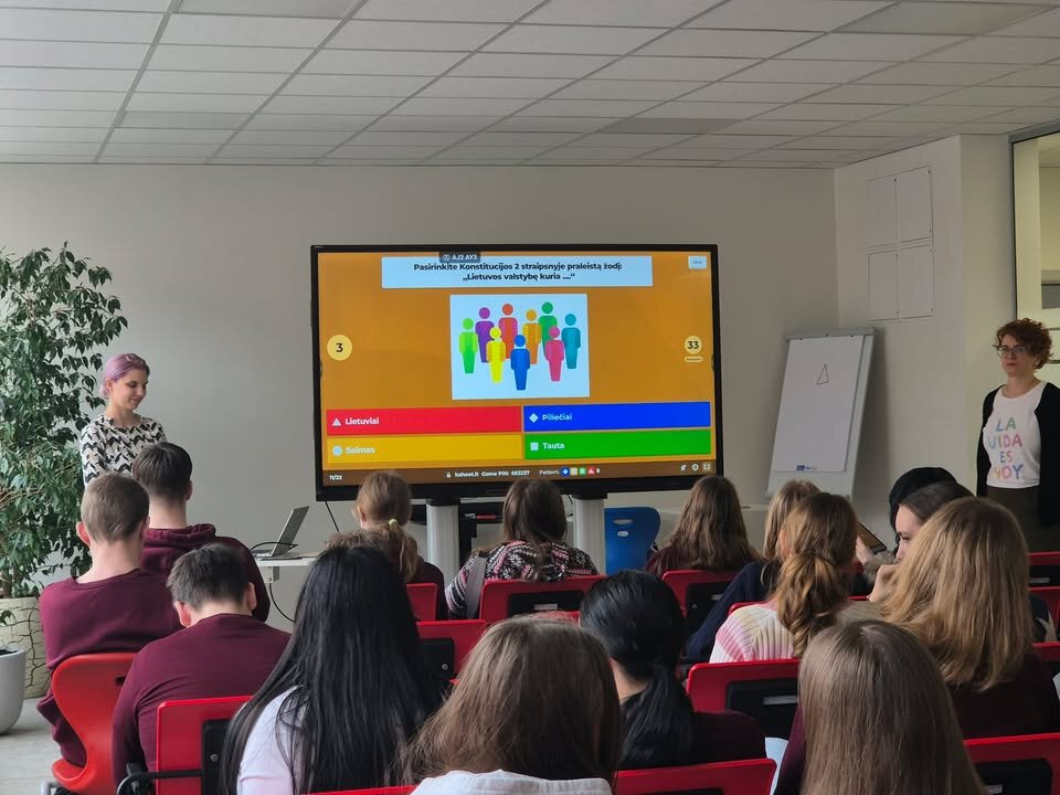 Mūsų gimnazijoje vyko LR Seimo kanceliarijos darbuotojų organizuojama pilietiškumo pamoka - Demokratijos žinių konkursas. Pamokoje dalyvavo I S(veik), I G klasės ir III klasių mokinių grupė. Šios pamokos metu susidomėję mokiniai sprendė interaktyvų testą. Klausimai apėmė įvairias temas – nuo Lietuvos Nepriklausomybės atkūrimo iki šiuolaikinės politinės sistemos veikimo. Interaktyvus pamokos formatas skatino mokinių įsitraukimą, bendradarbiavimą ir draugišką varžymąsi. Aktyviausi ir geriausiai pasirodę mokiniai sulaukė simbolinių prizų bei pagyrimų. Daugiausia taškų iš interaktyvaus testo surinko ir I vietą užėmė I S(veik) klasės mokinė Goda Šupšinskaitė, II vietą I S(veik) klasės mokinė Taira Ulevičiūtė, III vietą Mantvilė Borumaitė III G klasė.