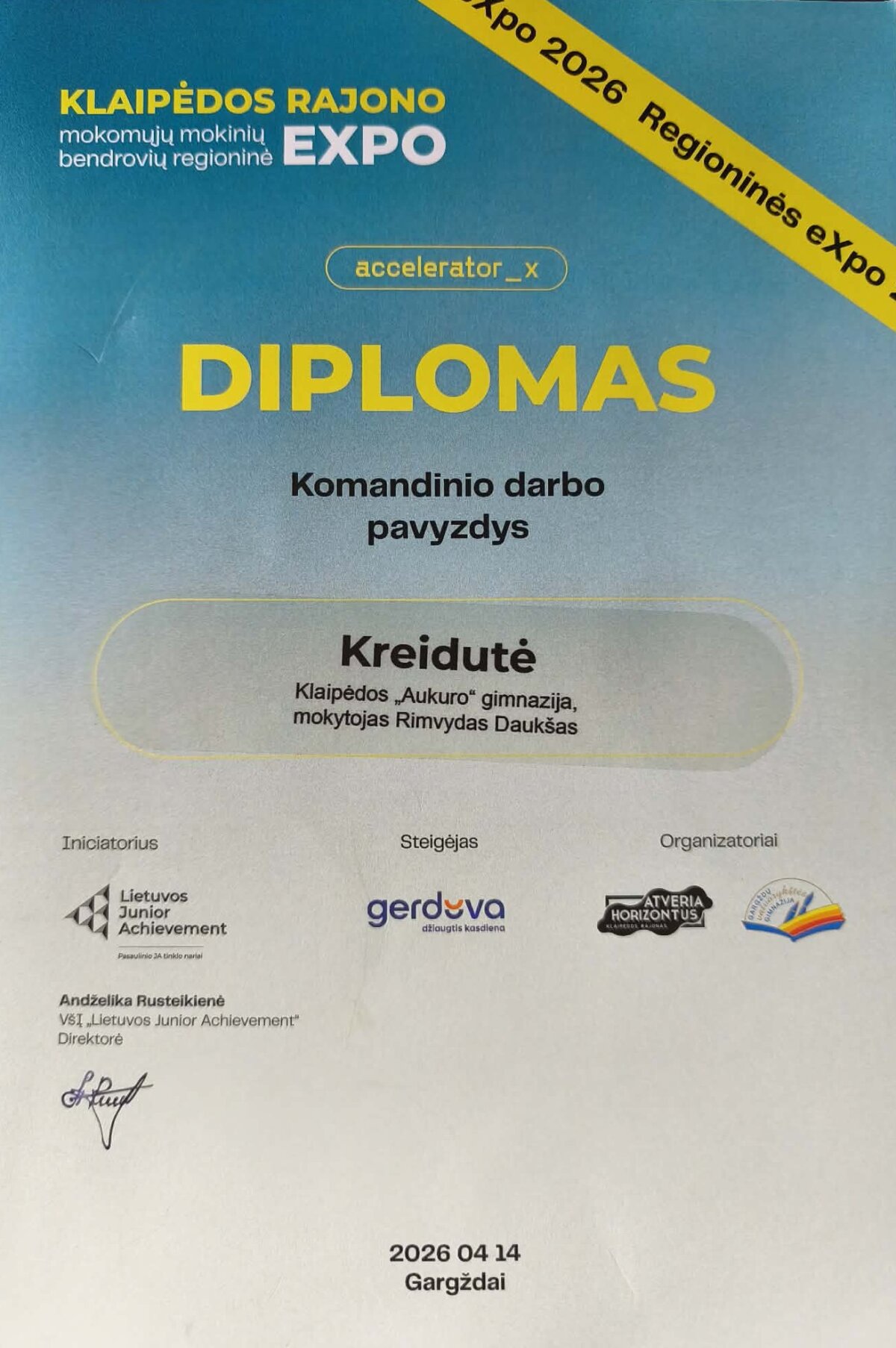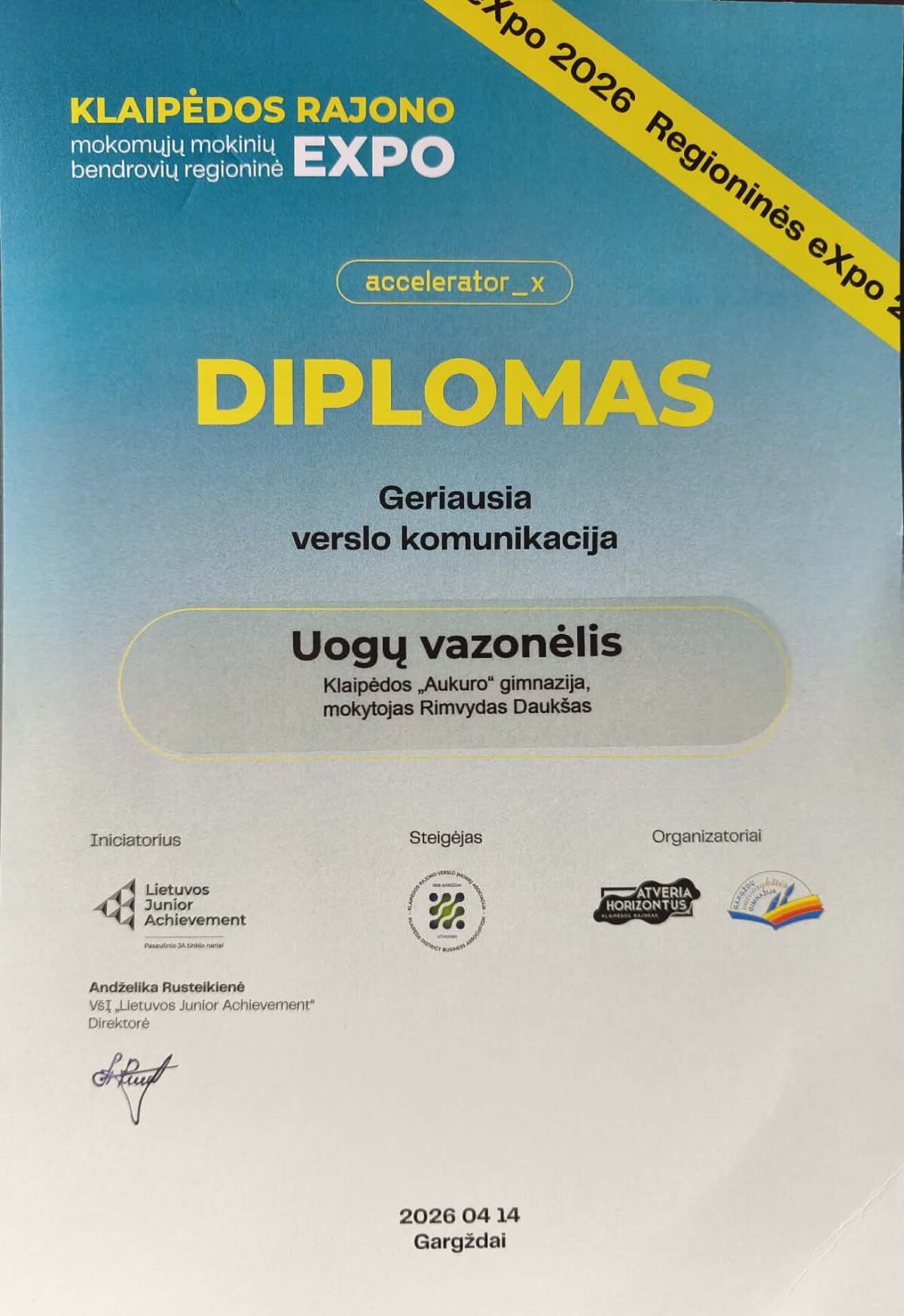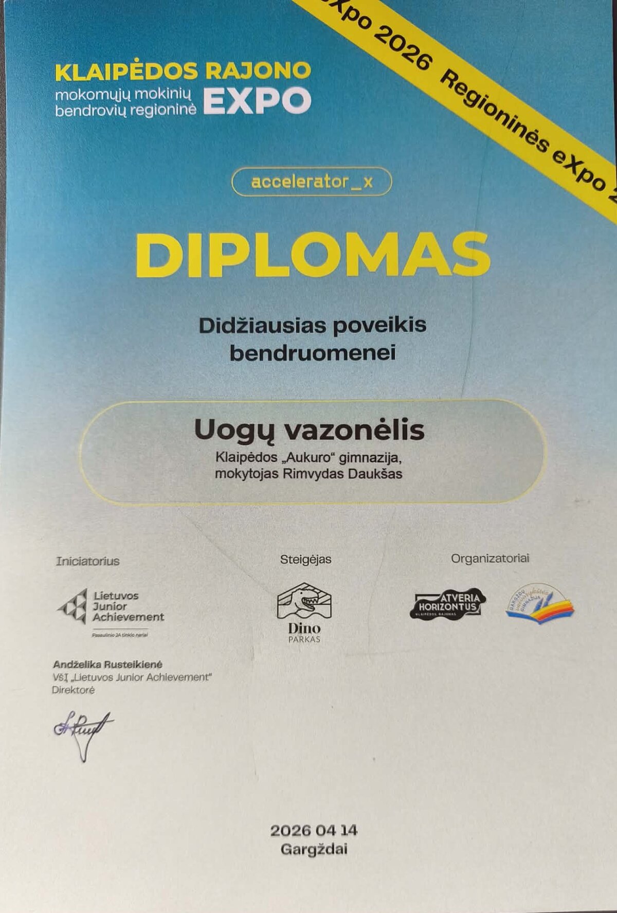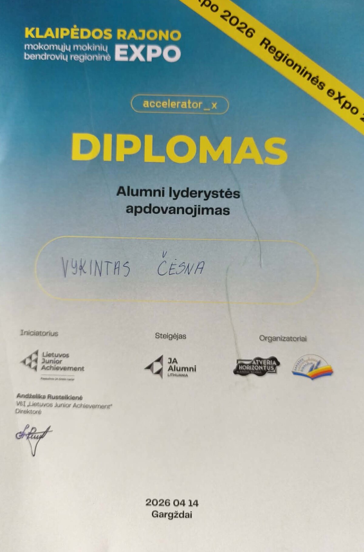 Mūsų gimnazistai grįžo ne tik su šypsenomis, bet ir su apdovanojimais: „Komandinio darbo pavyzdys" (MMB „Kreidutė" II O), „Geriausia idėja Klaipėdos miestui" (MMB „MoveMatch" II G), „Geriausia verslo komunikacija" (MMB „Uogų vazonėlis" II H), „Didžiausias poveikis bendruomenei" (MMB „Uogų vazonėlis" II H), „Alumni lyderystės apdovanojimas" (Vykintas Čėsna II H). Tikimės, kad šie pasiekimai įkvėps kurti naujus inovatyvius produktus ir sėkmingai realizuoti jau sukurtus.