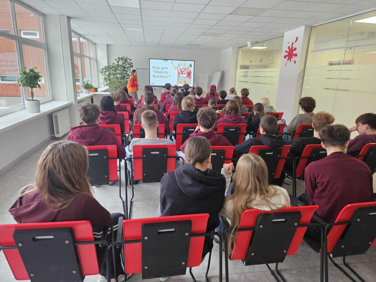 Kas 5-tam žmogui Lietuvoje trūksta lėšų būtinam maistui. Per metus šalyje susidaro apie 400 000 tonų išmetamo maisto. Kas yra „Maisto bankas"? Kaip jis kovoja su maisto švaistymu ir nepritekliumi? Kaip mes galime prisidėti savanoriaudami? Atsakymus į šiuos ir kitus klausimus I klasių aukuriečiai gavo per susitikimą su "Maisto banko" Klaipėdos padalinio savanorių koordinatore Roberta Šikšniūte.